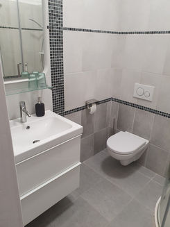 Samostatné sociální zařízení se sprchovým koutem, umyvadlem, WC a fénem